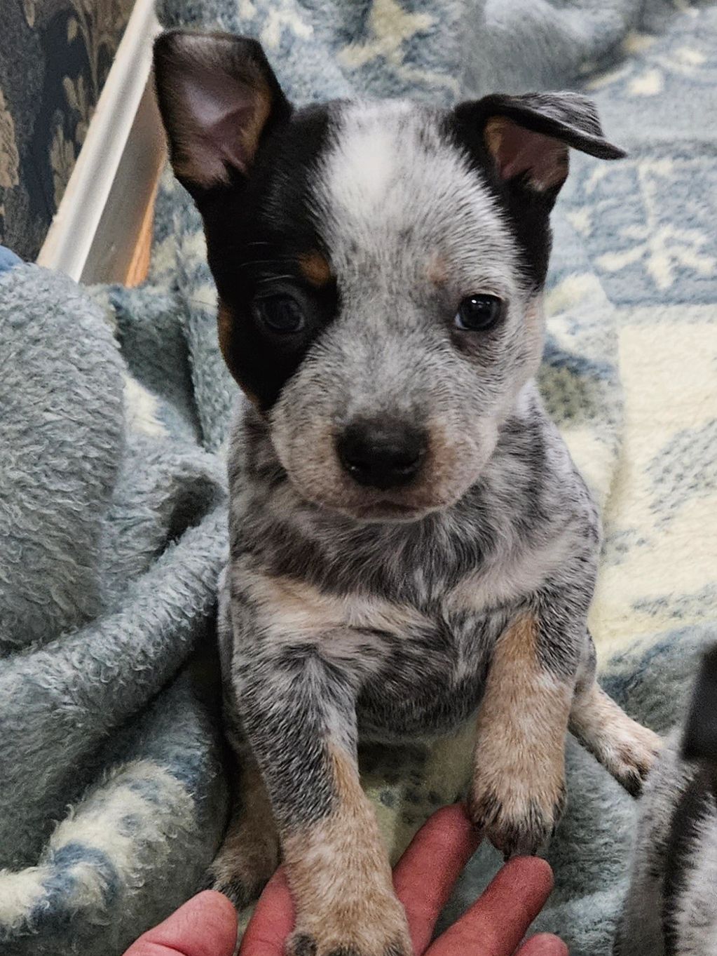 Gator measures 15 inches and weighs 43 pounds with the standard cattle dog stocky build, he is a thick boy. He has a super sweet temperament, loves everyone he meets, and his favorite pass time is snuggling and playing tennis ball. He is passing his dark color and amazing temperament to his off spring .